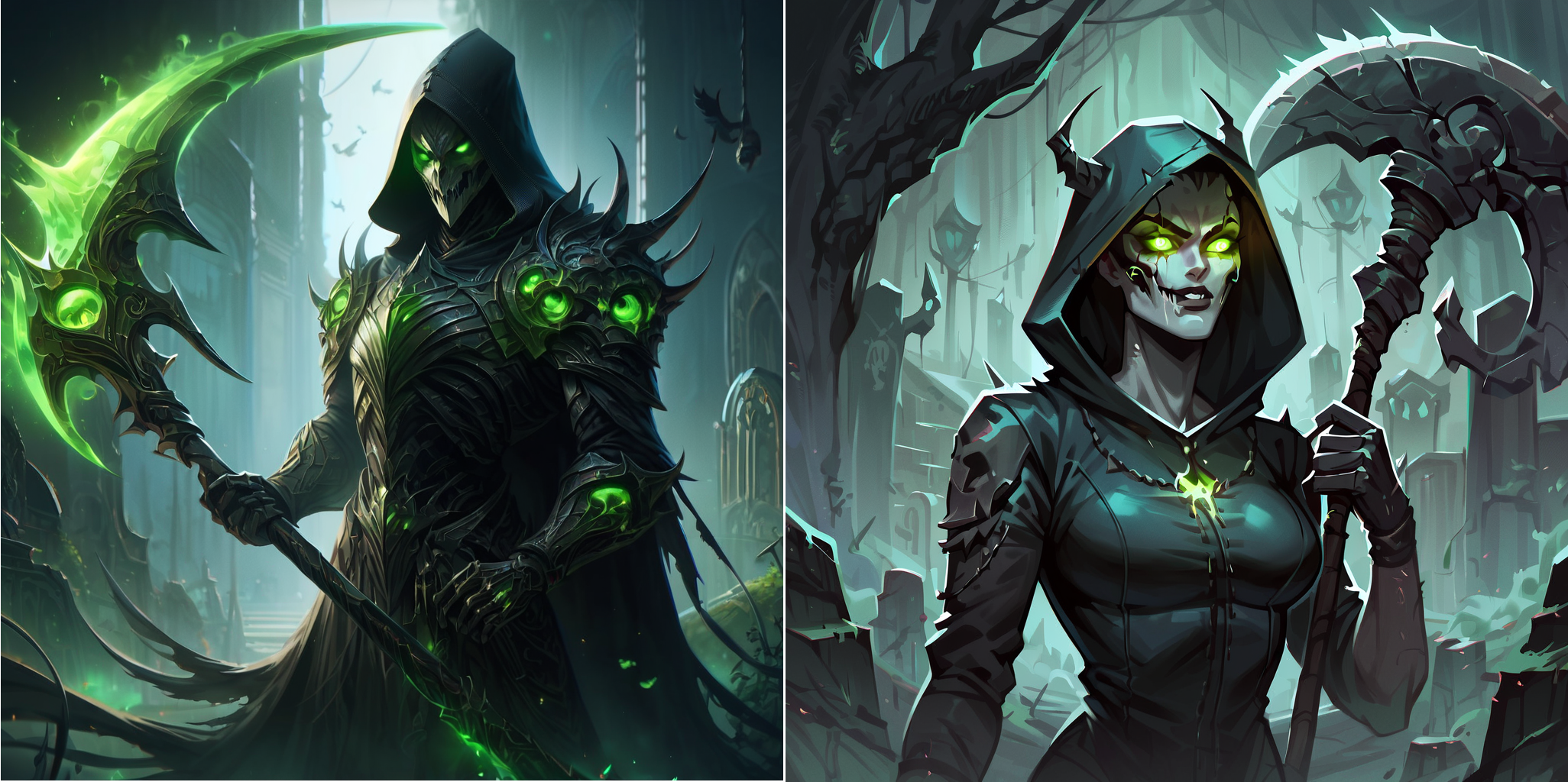 "score_9, score_8_up, score_7_up, score_6_up, score_5_up, score_4_up, (cinematic shot of a female grim reaper, hooded, glowing green eyes, holding green scythe:1.2), graveyard in background,"