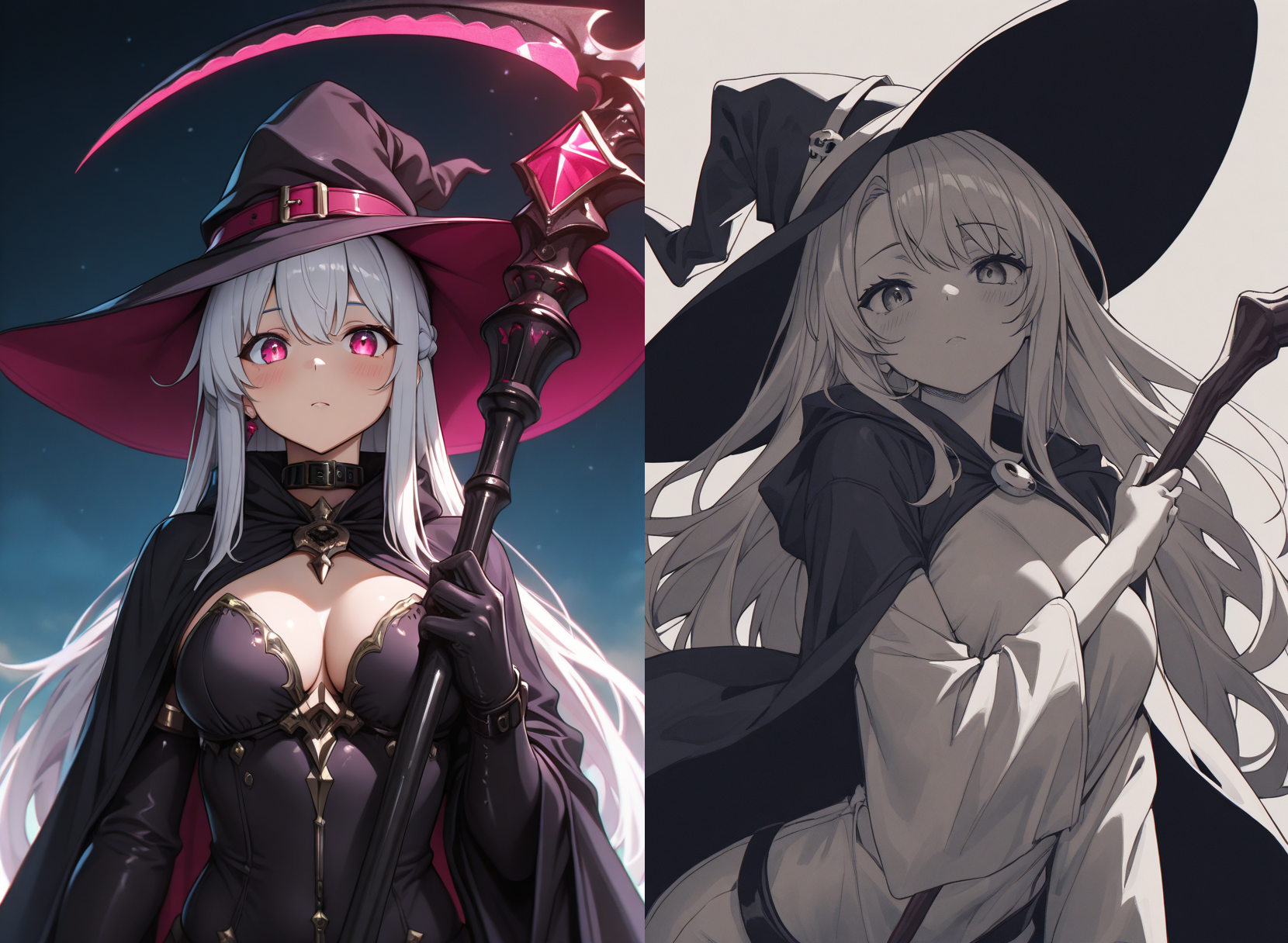 "HDR, 8k, high contrast, masterpiece, best quality, amazing quality, very aesthetic, high resolution, ultra-detailed, absurdres, newest, scenery, (1girl, upper body, witch, wearing magical dress and witch hat, facing the viewer, she is (swielding a giant glowing scythe:1.25):1.2)"
