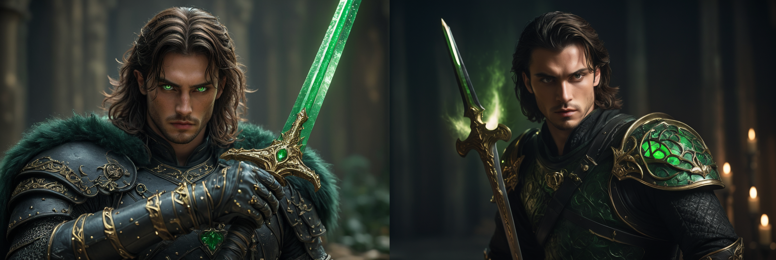 "A handsome young man with dark brown hair and green eyes, wearing black armor decorated with gold and green accents holding an emerald sword, with detailed face features, in cinematic lighting with a cinematic shot from a cinematic angle, in a dark fantasy medieval setting, (hkstyle:1.2), (green flames comming from the blade of his sword:1.1)"