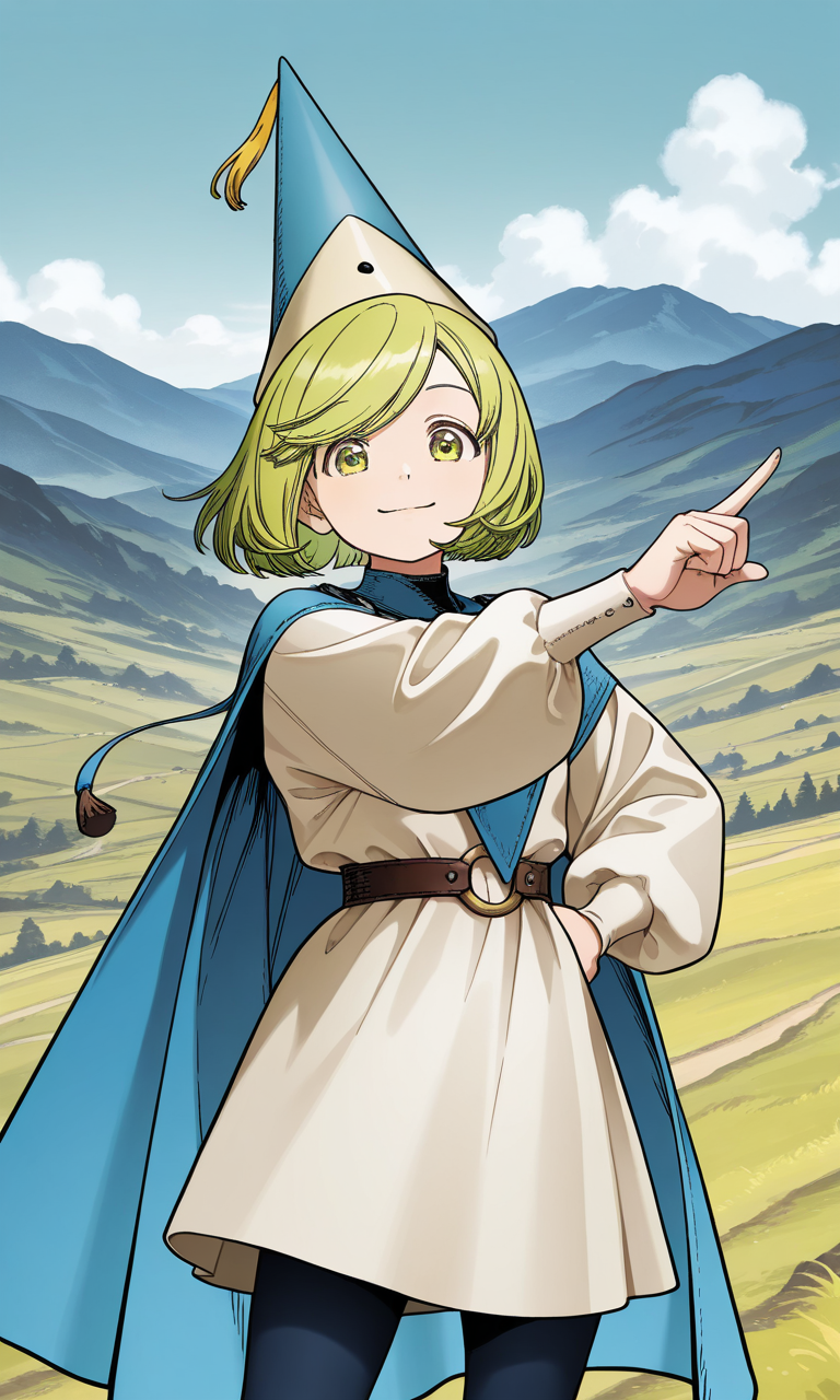 tasseled blue white cone hat, blue white cape, long-sleeved white shirt, dark leggings, yellow shoes,